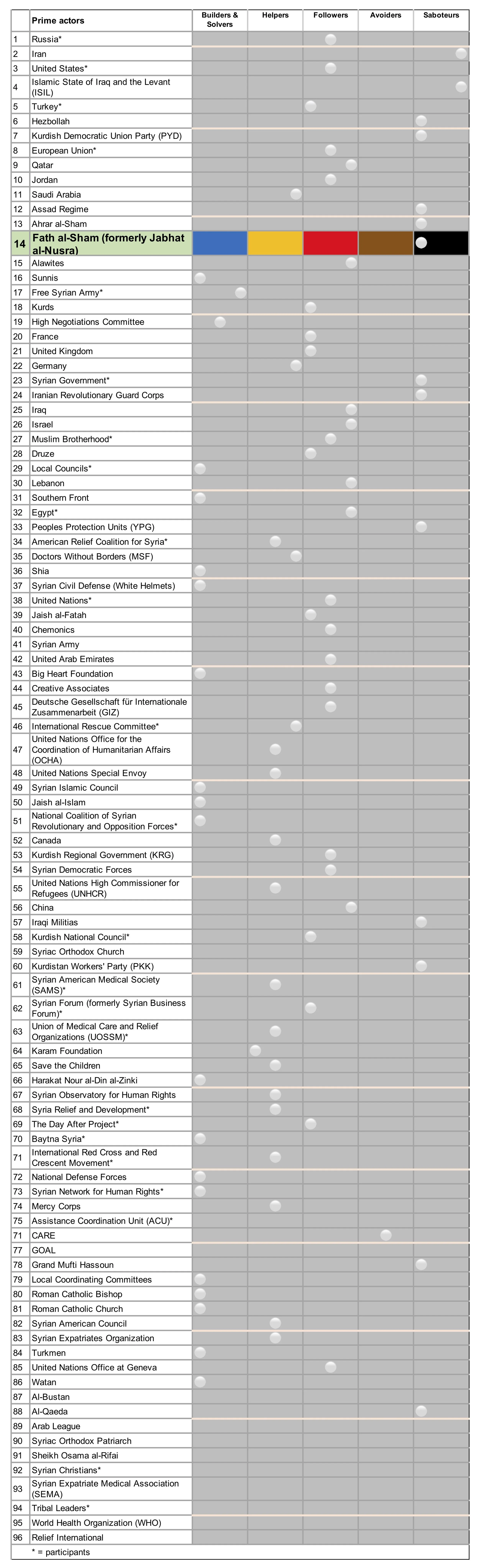 تَمّ تَعْرِيف 96 مُنَظَّمَة وجِهَة مَحَلِّيَّة وإقْلِيميَّة ودَوْلِيَّة كـ ’جِهَات فَاعِلَة‘ وهِي الجِهَات الَّتِي لَهَا تَأْثِير عَلَى الحَيَاة فِي سوريا. يُوَضِّح العَمُود الأَيْسَر فِي الرَّسْم البَيَانِيّ أَدْنَاه مَرْتَبَة كُلُّ مِنْ الجِهَات الفَاعِلَة وِفقَا لِمَدَى نُفُوذهَا و تَأْثِيرهَا عَلَى تَشْكِيل الحَيَاة بِسوريا بَدْءَا مِنْ الأَكْثَر تَأْثِيرَا وَهِي ’روسيا‘ وإِلَى الأقَلّ تَأْثِيرَا وهِي ’مُنَظَّمَة الإِغَاثَة الدَّوْلِيَّة‘.
