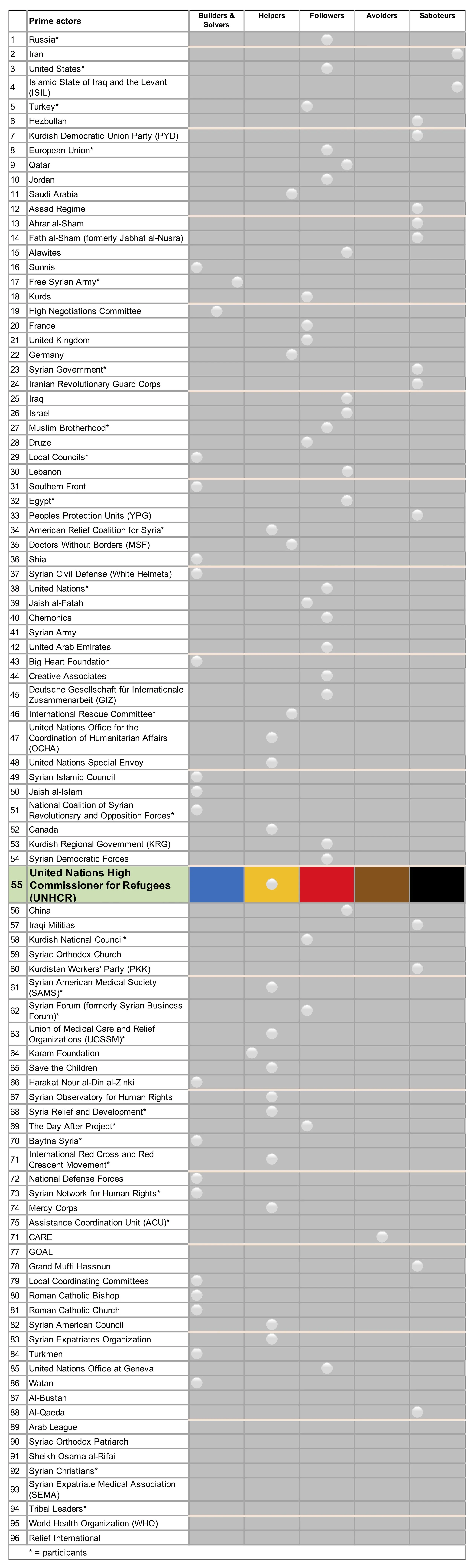 - Assessing and classifying UNHCR according to its commitment to inclusive nationalism for Syria (also indicated in the same row by the colored rectangle). Of the 25 prime actors who participated in the assessments, more agreed that UNHCR falls under the category of 'Helper'. A prime actor assessed as Helper is seen as supportive of and contributing to inclusive nationalism for Syria, but has other priorities that it considers more important.